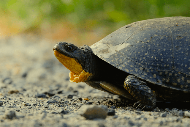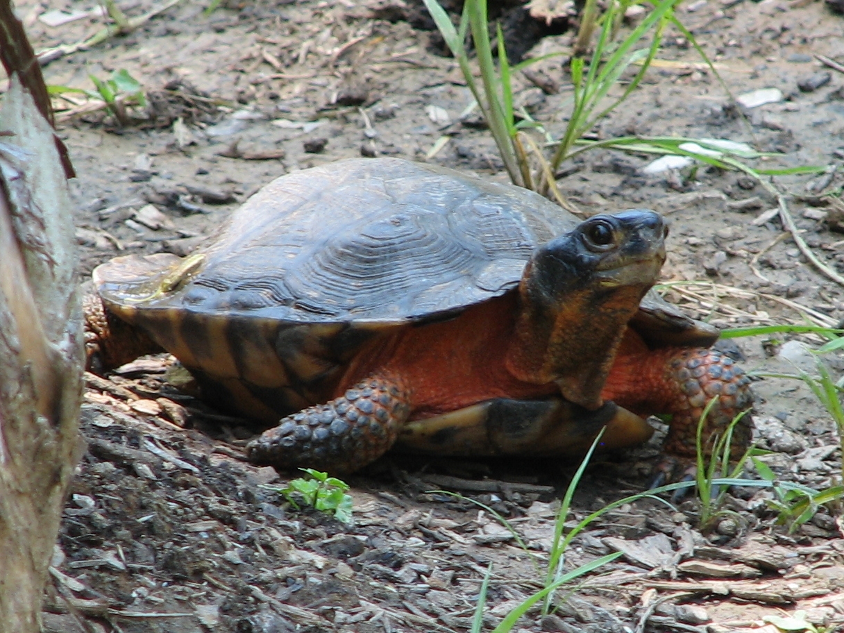 This is another iconic species known for their semi-aquatic behavior and intelligence. Known for performing a “rain dance” to entice earthworms to the surface of the ground so they can eat them, Wood Turtles have a few tricks up their sleeves. They sport bright orange on the skin on their legs and throat, while their shells vary between tan to brown with black or yellow lines on each scute. This species is also sadly in decline.