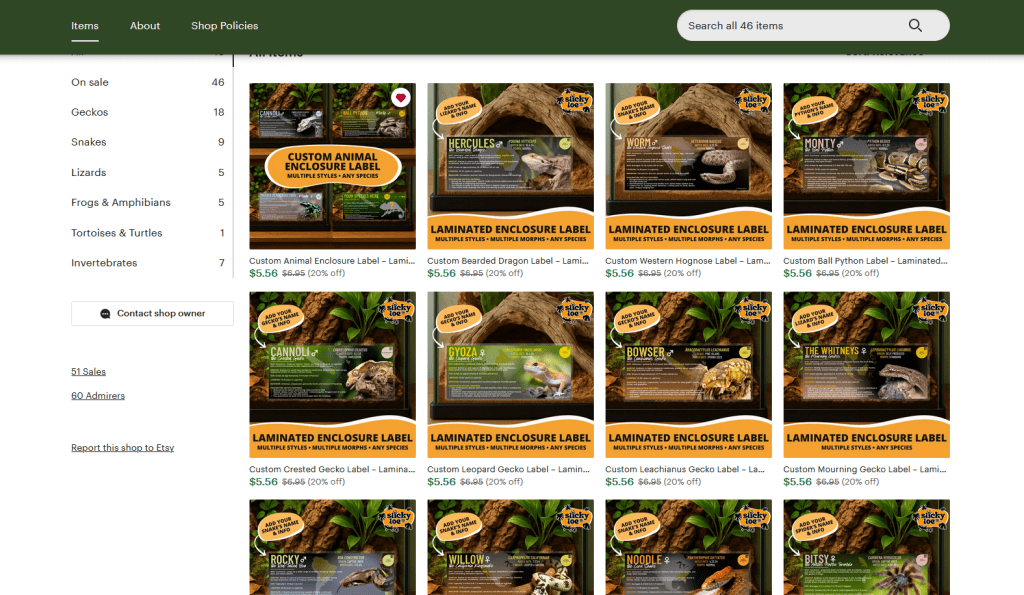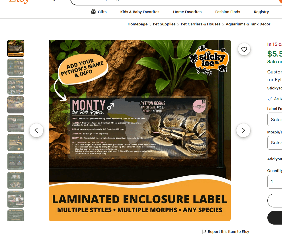 This shop specializes in professional looking enclosure labels for a multitude of reptiles, amphibians, and some invertebrates. They have a zoo facility quality look and information on the animals inside. Very reasonably priced!