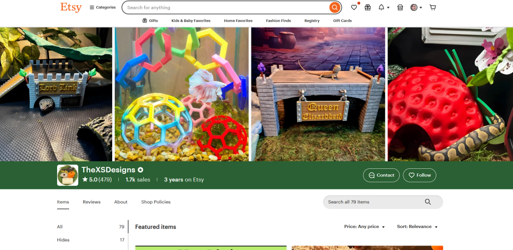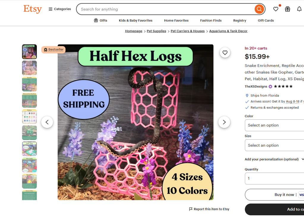 On Etsy for 3 years, this seller carries lots of reptile enrichment structures, feeders, trays, bowls, and name plates. A lot of really cool designs for enrichment, and would definitely recommend for anyone wanting to give their animals extra activities. Worth a look.