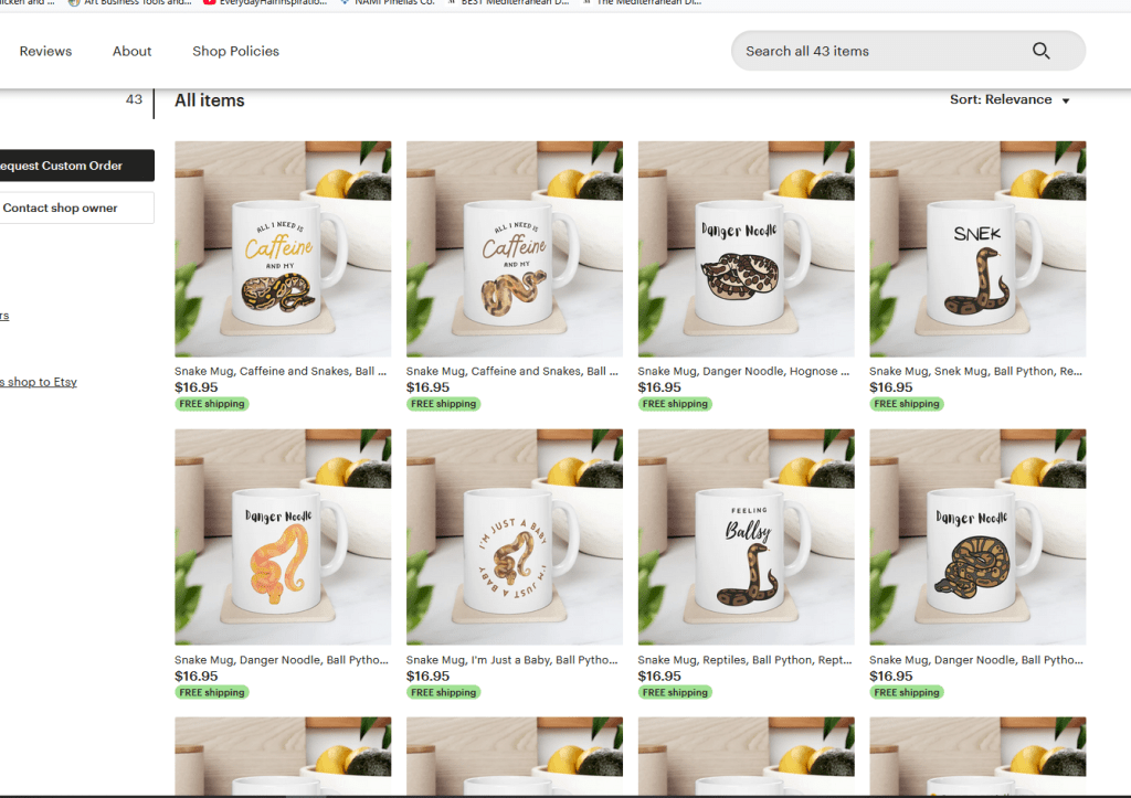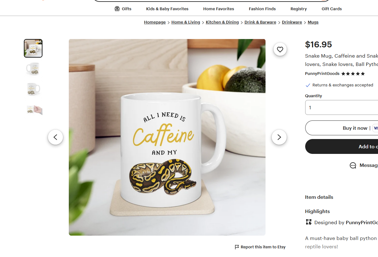 A mug seller with lots of cute reptile designs to go with your morning coffee or tea. You can’t go wrong if you’re looking for a gift for the snake or lizard owner. You may even find something for yourself. Check them out!
