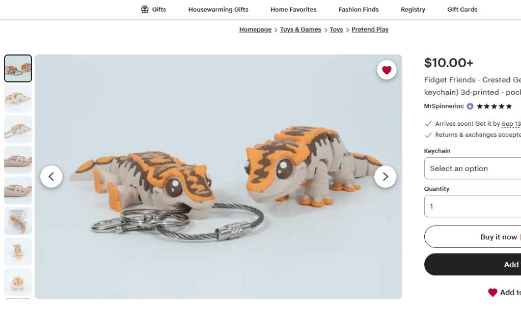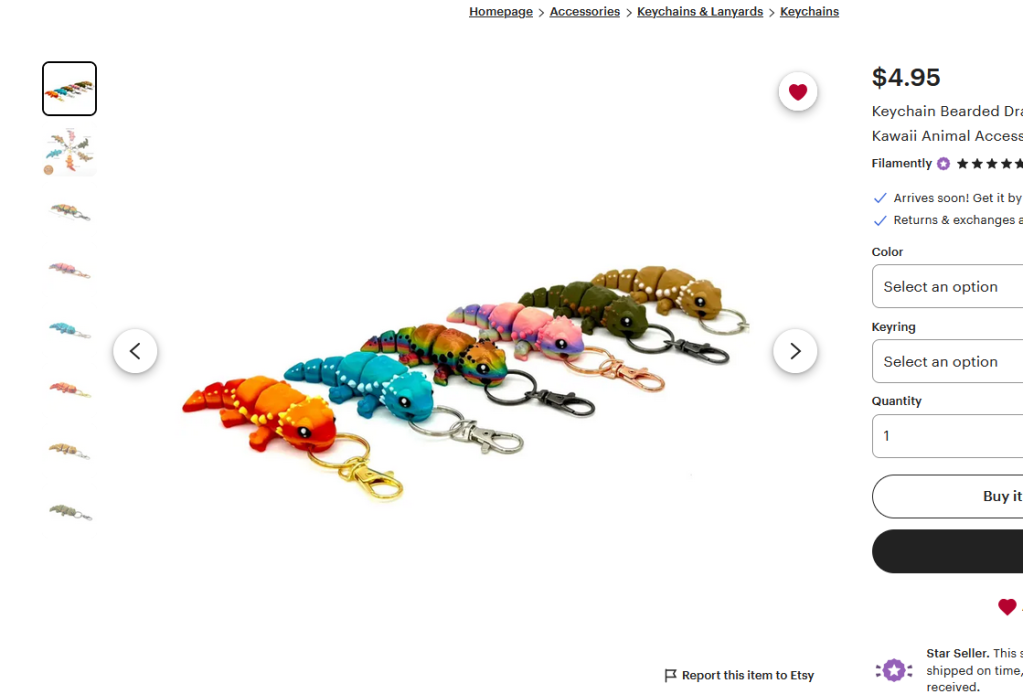 Using 3D printing, this seller has created some pretty unique reptile keychains, articulated figures, cases, and trays. I’ve ordered bearded dragon and axlotl keychains, and should be receiving them in a day or two. I love the use of vibrant colors in all the products. All are available at very affordable pricing.