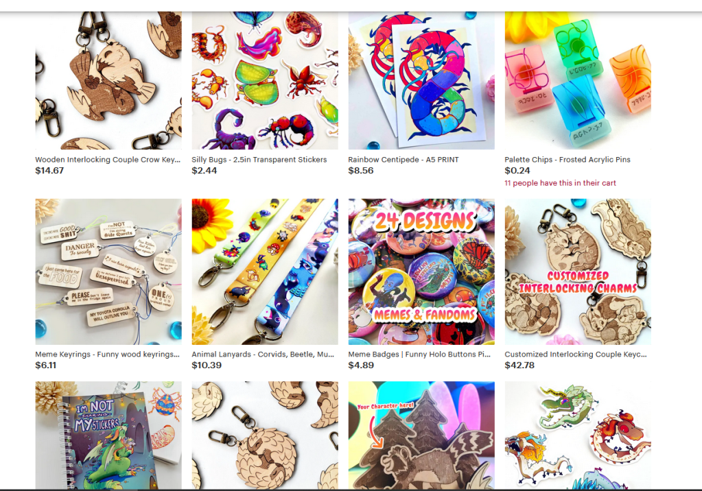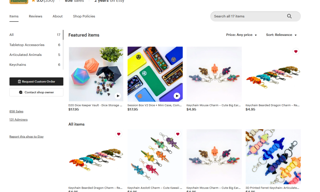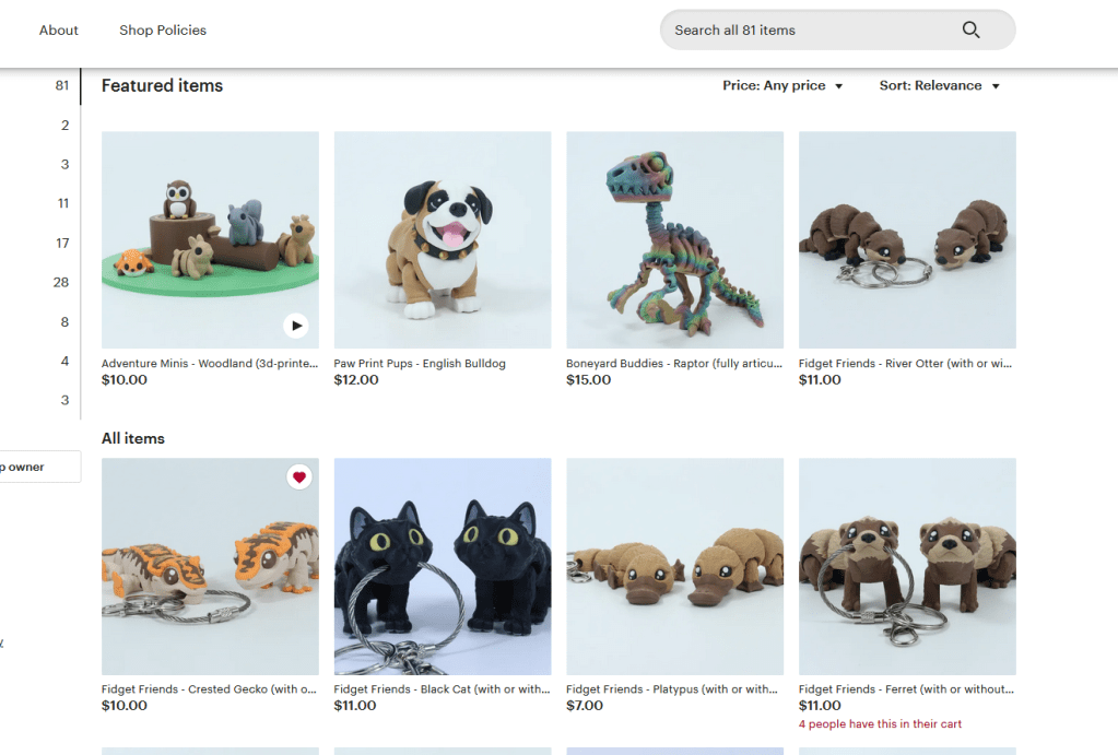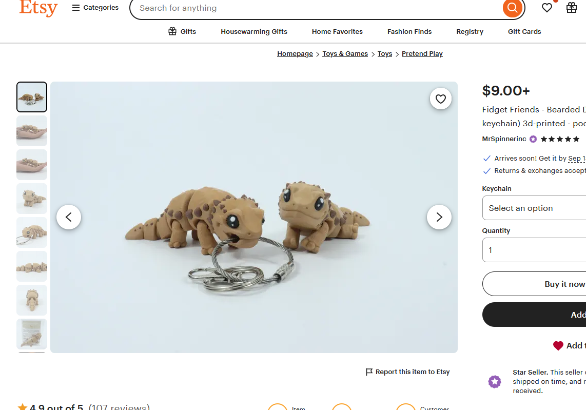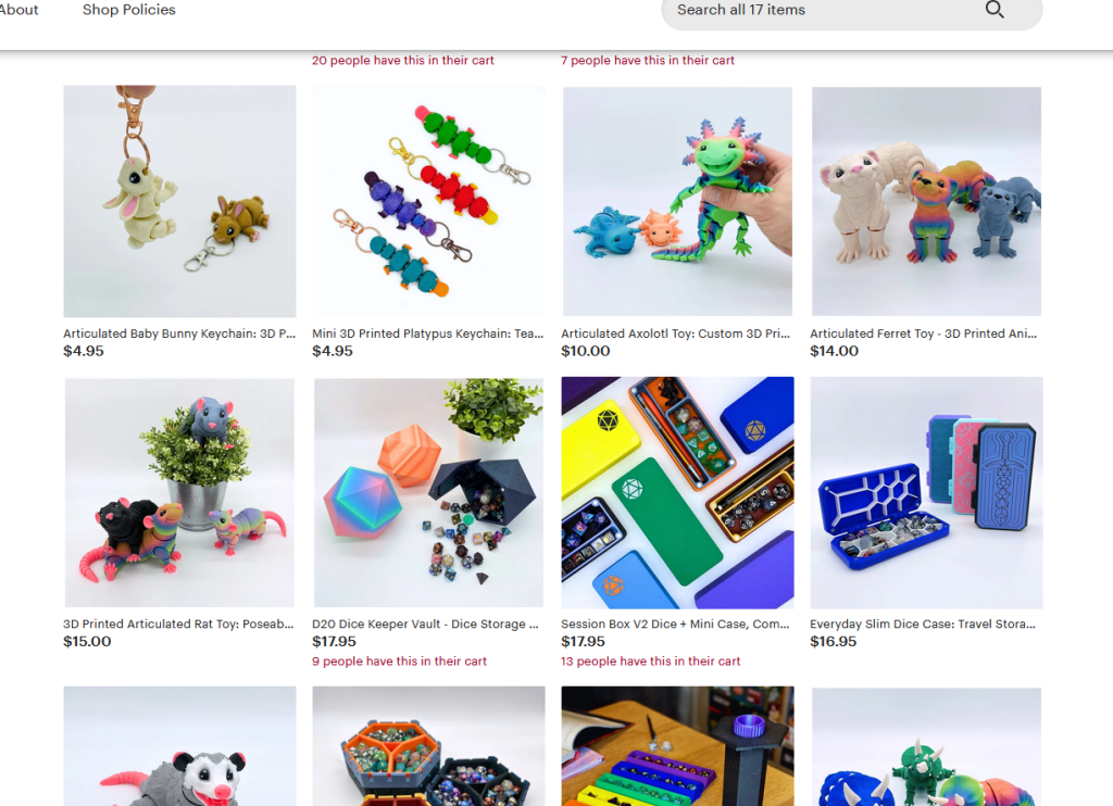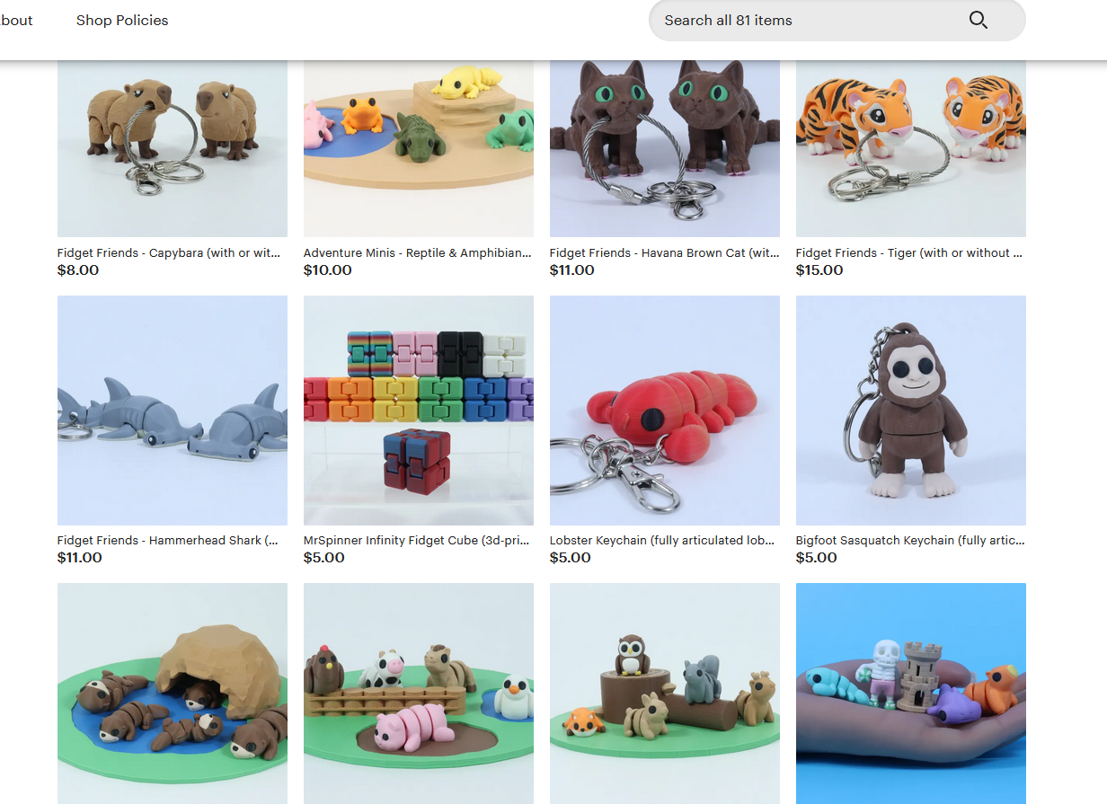 Another 3D printer, this seller offers mainly fidget toys, but as keychains, and play sets. They have a wide array of animals, including mammals, a few reptiles, and amphibians. I really like the articulation points and the overall designs.
