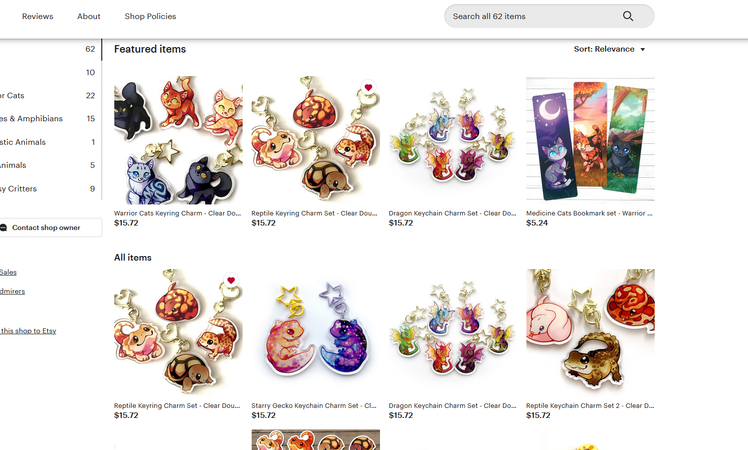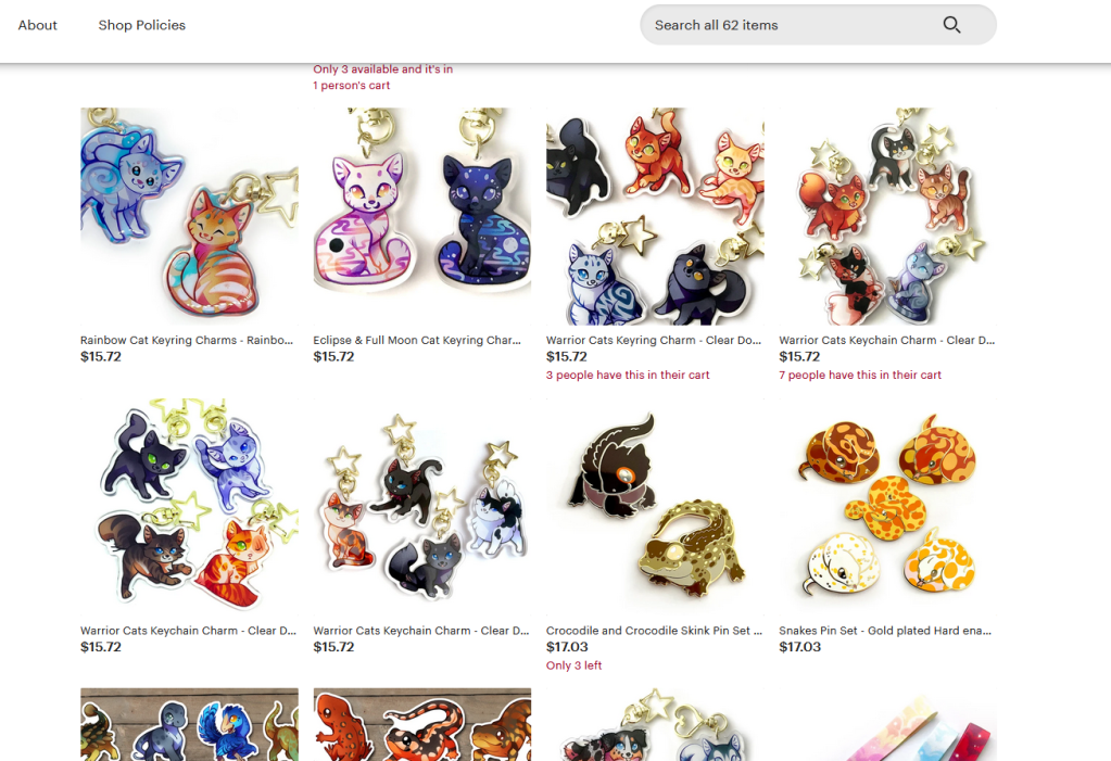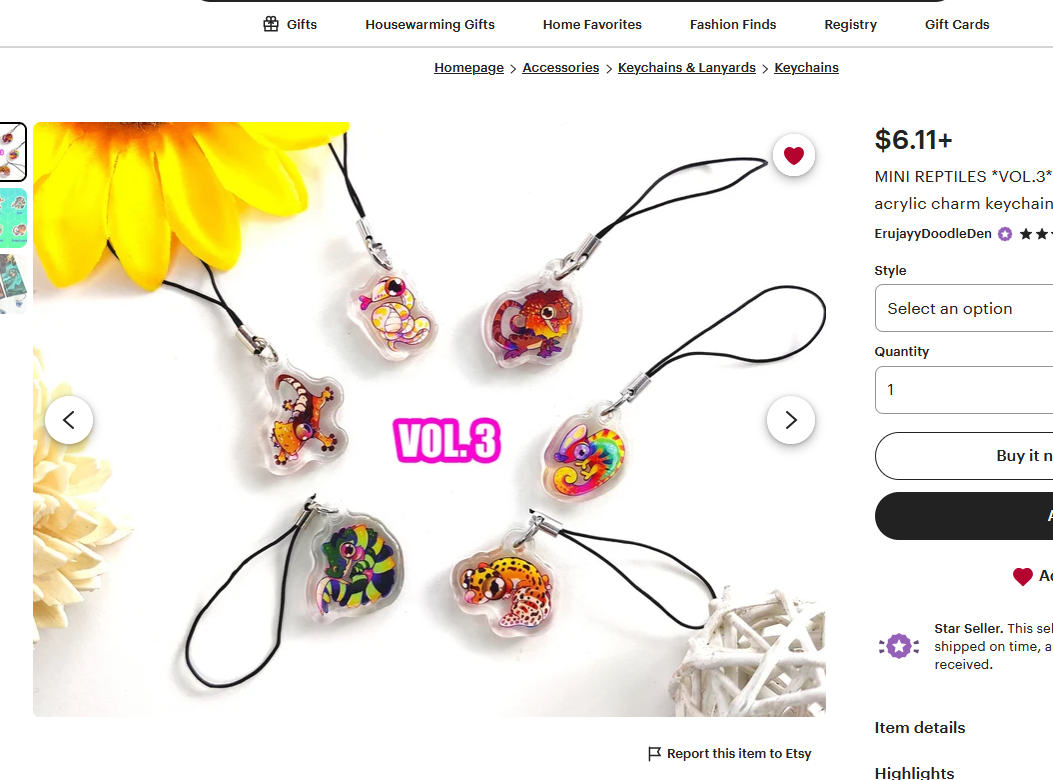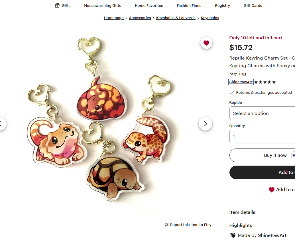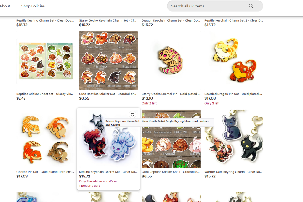 I really love this style of cutesy animal art. This artist carries some really cool cat and fox designs, and all the favorite reptiles and herps from the hobby. You can purchase keychains, charms, stickers, pins, and lanyards. They are very popular for good reason.